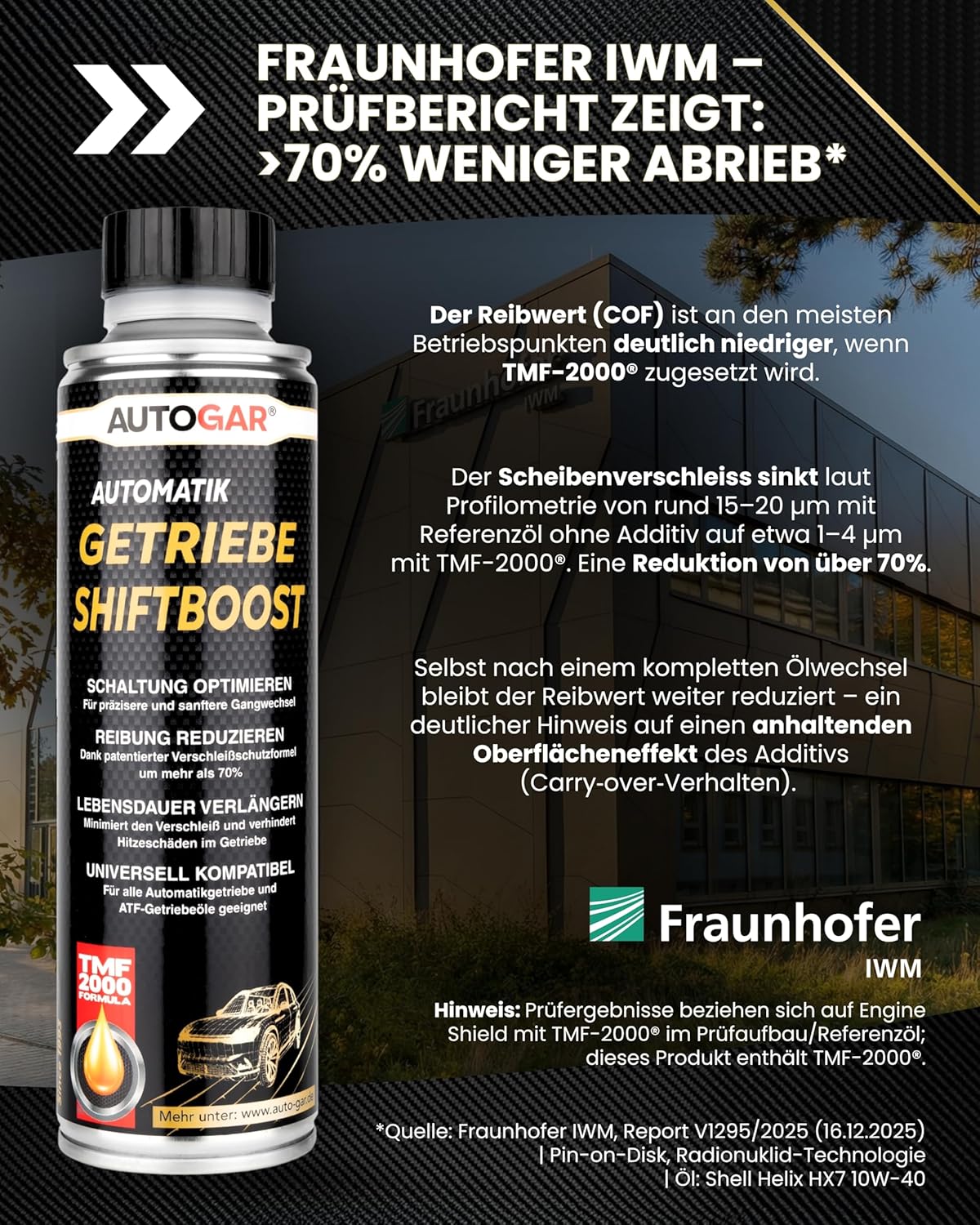 Automatikgetriebe arbeiten mit fein abgestimmten Reib- und Hydraulikprozessen. Automatik SHIFTBOOST ergänzt das vorhandene Getriebeöl um die TMF-2000®-Technologie, die tribologisch wirksam ist: Sie kann Reibung im Schmierkontakt reduzieren und damit den mechanischen Verschleiß hochbelasteter Bauteile verringern.