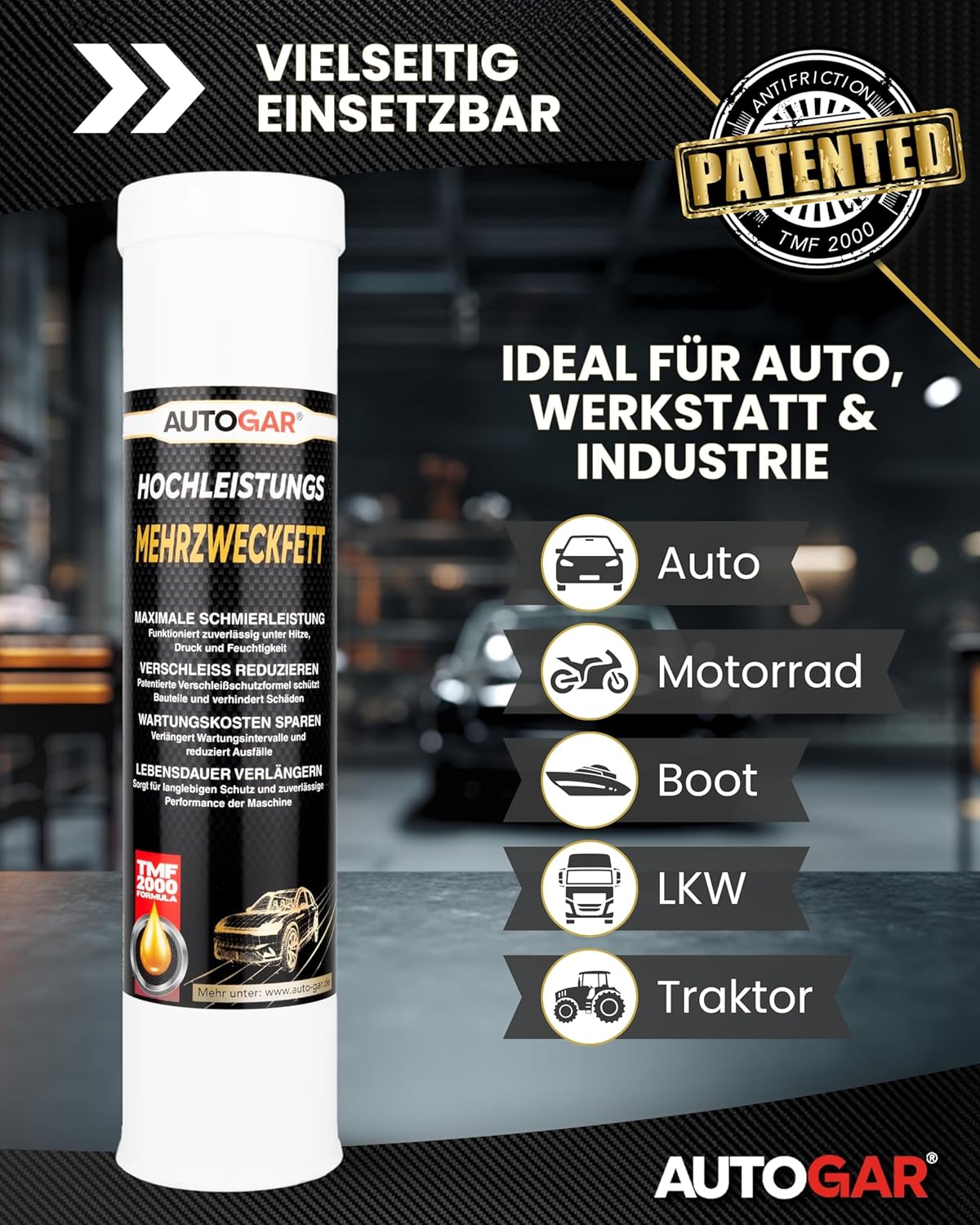 Das HOCHLEISTUNGS-MEHRZWECKFETT von AUTOGAR® ist ein universell einsetzbares Schmierfett für Fahrzeuge, Maschinen und Anlagen. Es bietet selbst unter hoher mechanischer Belastung eine zuverlässige Schmierwirkung und schützt dauerhaft vor Korrosion, Feuchtigkeit und Verschleiß.