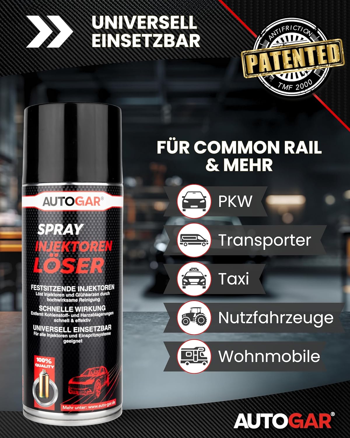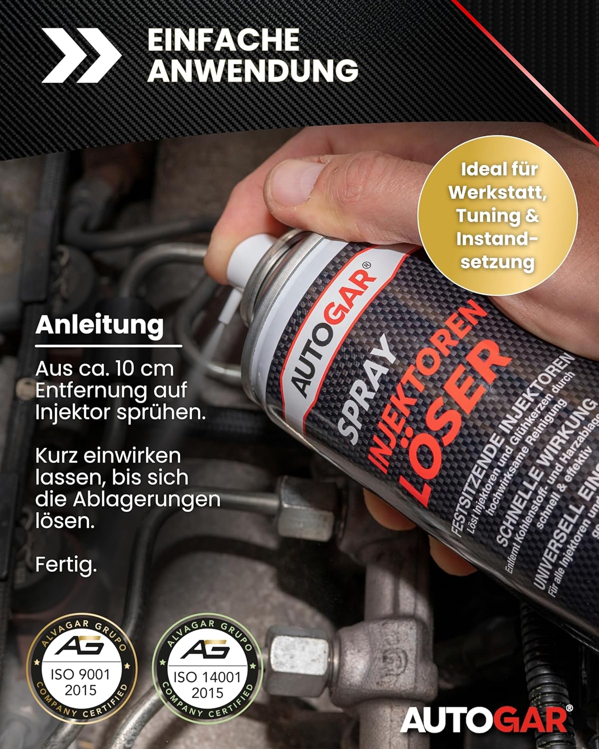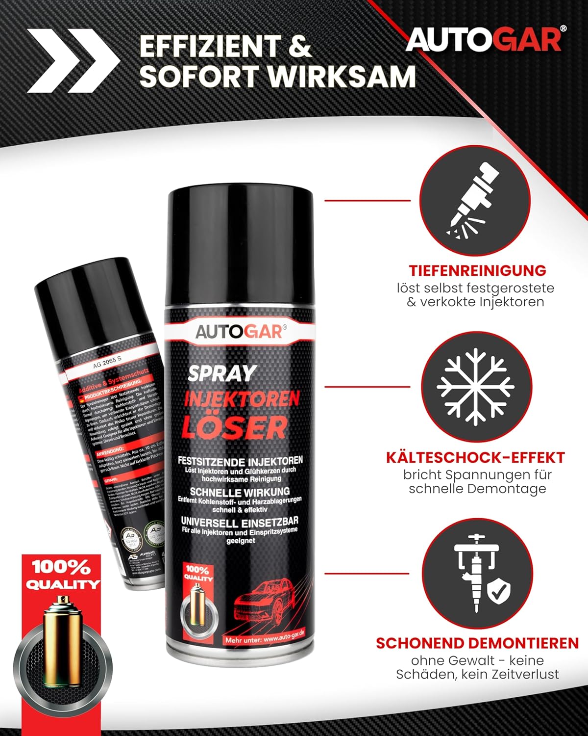 Der AUTOGAR® INJEKTOREN LÖSER SPRAY wurde speziell entwickelt, um festsitzende, verkokte oder korrodierte Injektoren schnell und sicher zu lösen. Dank seiner schnellwirkenden Formel mit Kälte-Effekt dringt das Spray tief in die Ablagerungen ein, löst Rost, Öl- und Kohlenstoffrückstände und erleichtert die Demontage ohne Beschädigung der Bauteile..