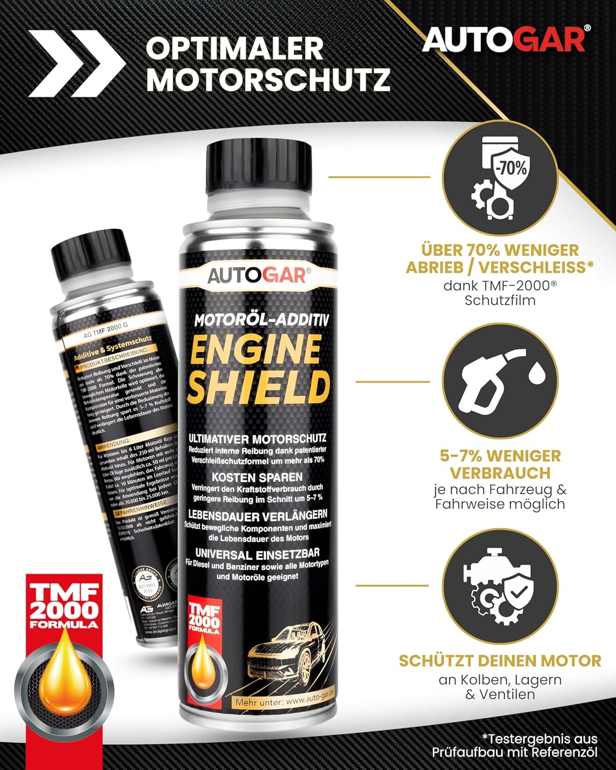 - ENGINE SHIELD (TMF-2000®): Anti-Friction-Technologie mit nachgewiesenem Effekt – Abrieb um über 70% reduzieren: ruhigerer Lauf, verbessertes Startverhalten und im Schnitt 5–7 % Kraftstoffersparnis durch weniger Reibung.