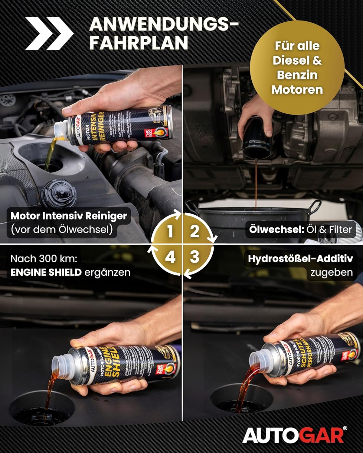 1.) Motor Intensiv Reiniger vor dem Ölwechsel anwenden → 2.) Ölwechsel + Filter → 3.) Hydrostößel-Additiv zugeben → 4.) Nach ca. 300 km Engine Shield ergänzen.
